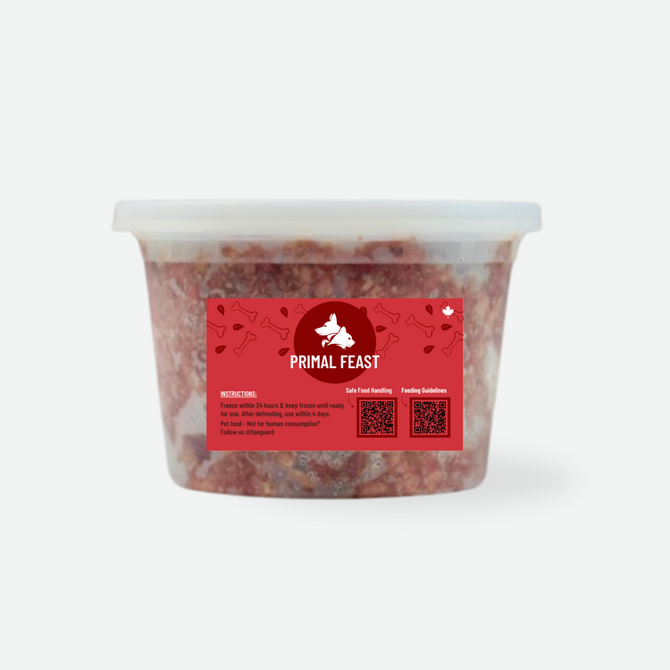 Formulated in an 80/10/10 ratio, Primal Feast is not a complete diet on its own but serves as a versatile base for homemade recipes, specific dietary needs, as a treat, or supplementing/adding toppers to your pet’s existing raw meals.
